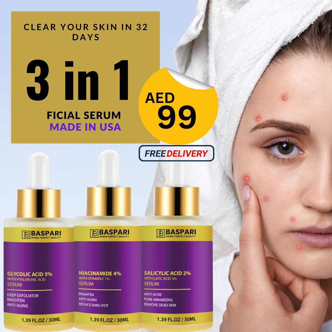 Achieve clear, radiant, and smooth skin with the Baspari 3-in-1 Serum Set—a powerful skincare trio designed to target acne, dark spots, dullness, and uneven texture. Whether you’re dealing with breakouts, clogged pores, or pigmentation, this dermatologist-formulated set has the active ingredients your skin needs to look its best every day.