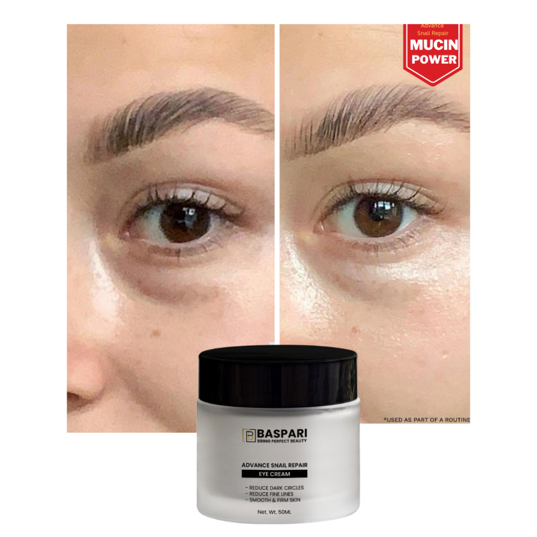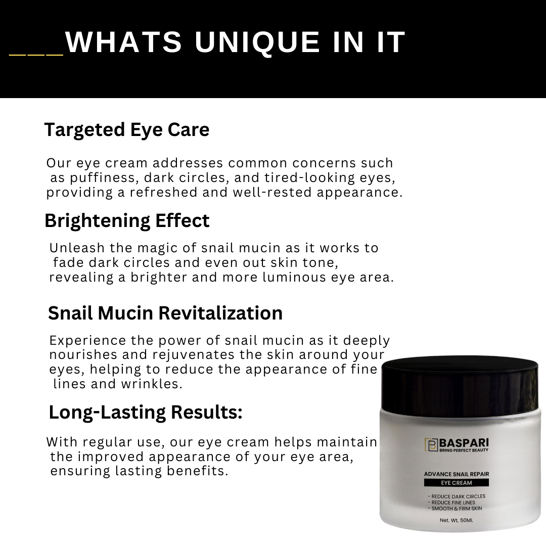 Baspari Snail Mucin Eye Cream is a premium skincare gem specially formulated to target the delicate skin around your eyes. Infused with the miraculous properties of snail mucin, this eye cream is your secret to achieving youthful, bright, and refreshed eyes like never before!